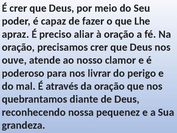 - É crer que Deus, por meio do Seu poder, é capaz de fazer o que Lhe apraz. É preciso aliar à oração a fé. Na oração, precisamos crer que Deus nos ouve, atende ao nosso clamor e é poderoso para nos livrar do perigo e do mal. É através da oração que nos quebrantamos diante de Deus, reconhecendo nossa pequenez e a Sua grandeza.