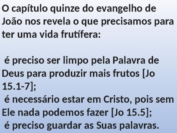 - O capítulo quinze do evangelho de João nos revela o que precisamos para ter uma vida frutífera: é preciso ser limpo pela Palavra de Deus para produzir mais frutos [Jo 15.1-7]; é necessário estar em Cristo, pois sem Ele nada podemos fazer [Jo 15.5]; é preciso guardar as Suas palavras.