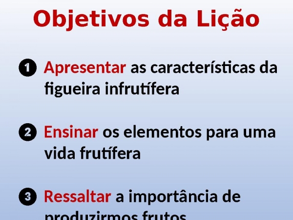 - Objetivos da Lição❶ Apresentar as características da figueira infrutífera❷ Ensinar os elementos para uma vida frutífera❸ Ressaltar a importância de produzirmos frutos