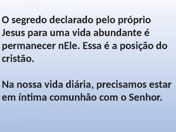 - O segredo declarado pelo próprio Jesus para uma vida abundante é permanecer nEle. Essa é a posição do cristão. Na nossa vida diária, precisamos estar em íntima comunhão com o Senhor.