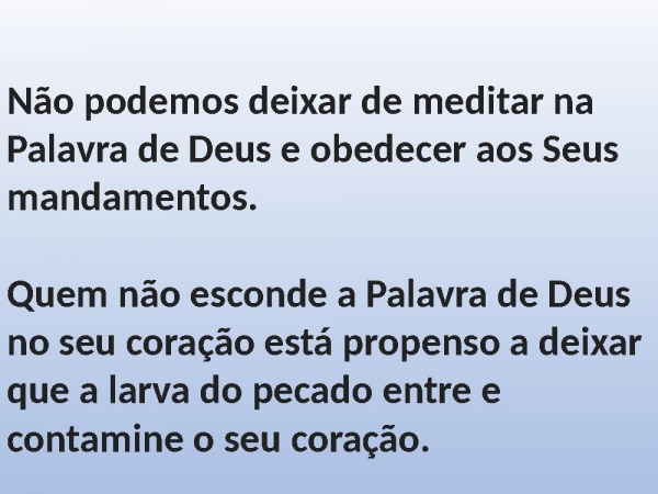 - Não podemos deixar de meditar na Palavra de Deus e obedecer aos Seus mandamentos. Quem não esconde a Palavra de Deus no seu coração está propenso a deixar que a larva do pecado entre e contamine o seu coração.
