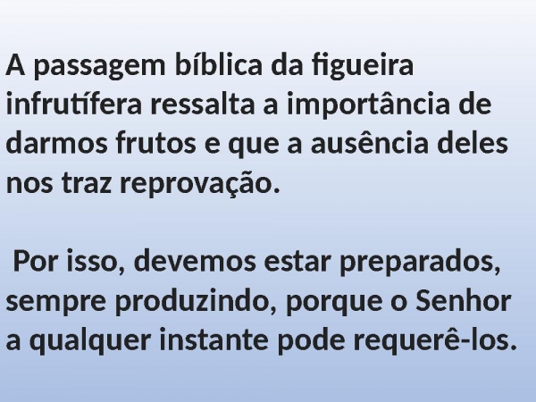 - A passagem bíblica da figueira infrutífera ressalta a importância de darmos frutos e que a ausência deles nos traz reprovação. Por isso, devemos estar preparados, sempre produzindo, porque o Senhor a qualquer instante pode requerê-los.