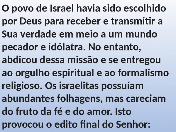 - O povo de Israel havia sido escolhido por Deus para receber e transmitir a Sua verdade em meio a um mundo pecador e idólatra. No entanto, abdicou dessa missão e se entregou ao orgulho espiritual e ao formalismo religioso. Os israelitas possuíam abundantes folhagens, mas careciam do fruto da fé e do amor. Isto provocou o edito final do Senhor: