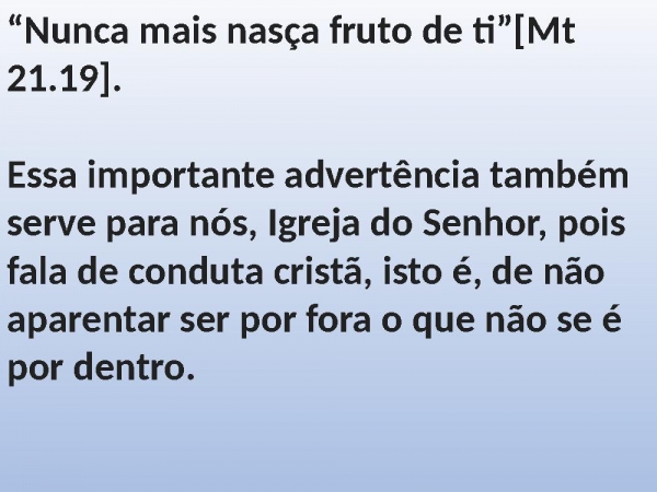 - “Nunca mais nasça fruto de ti”[Mt 21.19]. Essa importante advertência também serve para nós, Igreja do Senhor, pois fala de conduta cristã, isto é, de não aparentar ser por fora o que não se é por dentro.