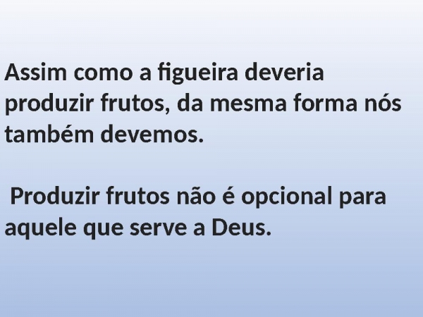 - Assim como a figueira deveria produzir frutos, da mesma forma nós também devemos. Produzir frutos não é opcional para aquele que serve a Deus.