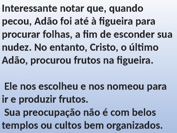- Interessante notar que, quando pecou, Adão foi até à figueira para procurar folhas, a fim de esconder sua nudez. No entanto, Cristo, o último Adão, procurou frutos na figueira. Ele nos escolheu e nos nomeou para ir e produzir frutos. Sua preocupação não é com belos templos ou cultos bem organizados.