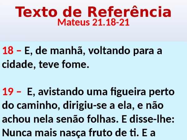 - Texto de ReferênciaMateus 21.18-2118 – E, de manhã, voltando para a cidade, teve fome.19 – E, avistando uma figueira perto do caminho, dirigiu-se a ela, e não achou nela senão folhas. E disse-lhe: Nunca mais nasça fruto de ti. E a figueira secou imediatamente.