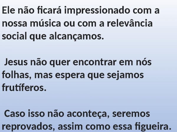 - Ele não ficará impressionado com a nossa música ou com a relevância social que alcançamos. Jesus não quer encontrar em nós folhas, mas espera que sejamos frutíferos. Caso isso não aconteça, seremos reprovados, assim como essa figueira.