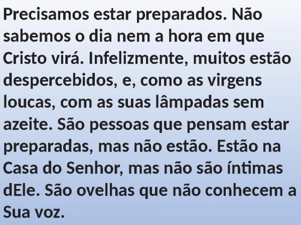 - Precisamos estar preparados. Não sabemos o dia nem a hora em que Cristo virá. Infelizmente, muitos estão despercebidos, e, como as virgens loucas, com as suas lâmpadas sem azeite. São pessoas que pensam estar preparadas, mas não estão. Estão na Casa do Senhor, mas não são íntimas dEle. São ovelhas que não conhecem a Sua voz.