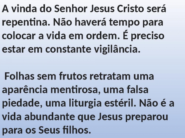 - A vinda do Senhor Jesus Cristo será repentina. Não haverá tempo para colocar a vida em ordem. É preciso estar em constante vigilância. Folhas sem frutos retratam uma aparência mentirosa, uma falsa piedade, uma liturgia estéril. Não é a vida abundante que Jesus preparou para os Seus filhos.