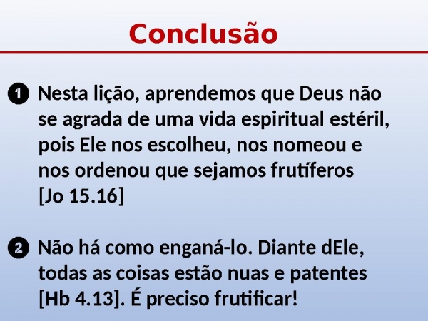 - Conclusão ❶ Nesta lição, aprendemos que Deus não se agrada de uma vida espiritual estéril, pois Ele nos escolheu, nos nomeou e nos ordenou que sejamos frutíferos [Jo 15.16]❷ Não há como enganá-lo. Diante dEle, todas as coisas estão nuas e patentes [Hb 4.13]. É preciso frutificar!