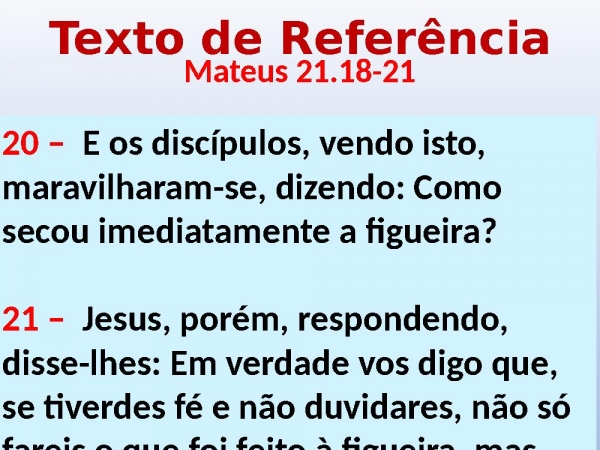 - Texto de ReferênciaMateus 21.18-2120 – E os discípulos, vendo isto, maravilharam-se, dizendo: Como secou imediatamente a figueira?21 – Jesus, porém, respondendo, disse-lhes: Em verdade vos digo que, se tiverdes fé e não duvidares, não só fareis o que foi feito à figueira, mas até, se a este monte disserdes: Ergue-te e precipita-se no mar, assim será feito.