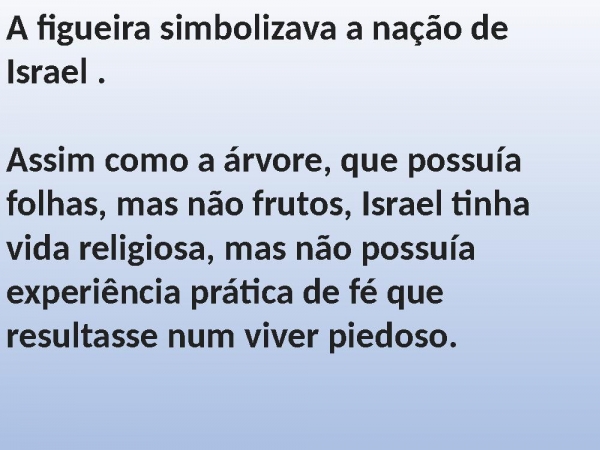 - A figueira simbolizava a nação de Israel .Assim como a árvore, que possuía folhas, mas não frutos, Israel tinha vida religiosa, mas não possuía experiência prática de fé que resultasse num viver piedoso.