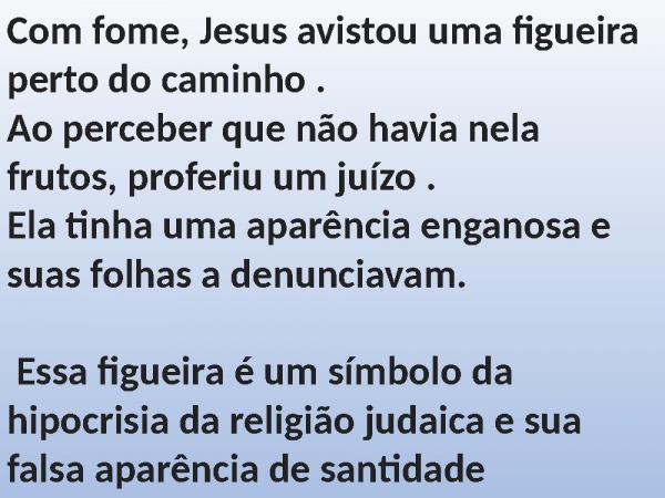 - Com fome, Jesus avistou uma figueira perto do caminho . Ao perceber que não havia nela frutos, proferiu um juízo .Ela tinha uma aparência enganosa e suas folhas a denunciavam. Essa figueira é um símbolo da hipocrisia da religião judaica e sua falsa aparência de santidade