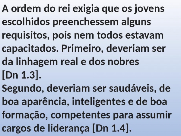 - A ordem do rei exigia que os jovens escolhidos preenchessem alguns requisitos, pois nem todos estavam capacitados. Primeiro, deveriam ser da linhagem real e dos nobres[Dn 1.3].Segundo, deveriam ser saudáveis, de boa aparência, inteligentes e de boa formação, competentes para assumir cargos de liderança [Dn 1.4].