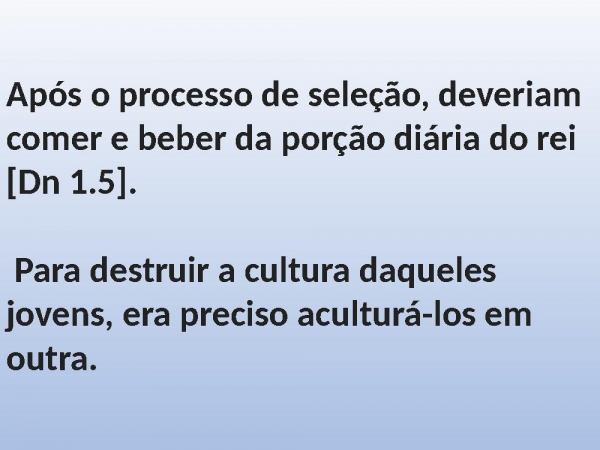 - Após o processo de seleção, deveriam comer e beber da porção diária do rei [Dn 1.5]. Para destruir a cultura daqueles jovens, era preciso aculturá-los em outra.