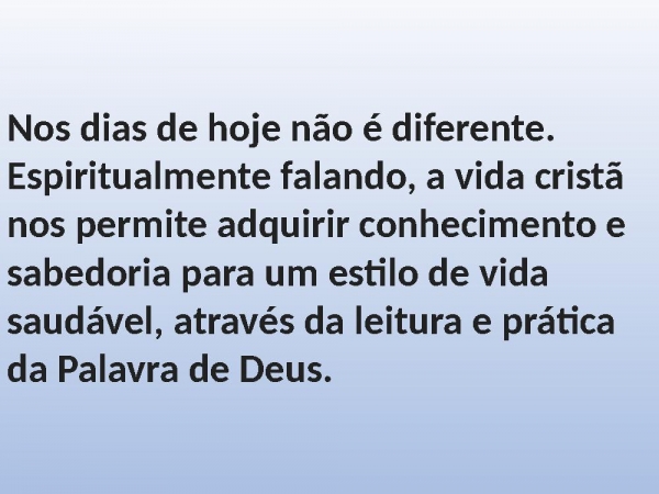 - Nos dias de hoje não é diferente. Espiritualmente falando, a vida cristã nos permite adquirir conhecimento e sabedoria para um estilo de vida saudável, através da leitura e prática da Palavra de Deus.