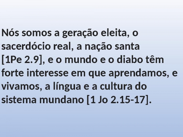 - Nós somos a geração eleita, o sacerdócio real, a nação santa [1Pe 2.9], e o mundo e o diabo têm forte interesse em que aprendamos, e vivamos, a língua e a cultura do sistema mundano [1 Jo 2.15-17].