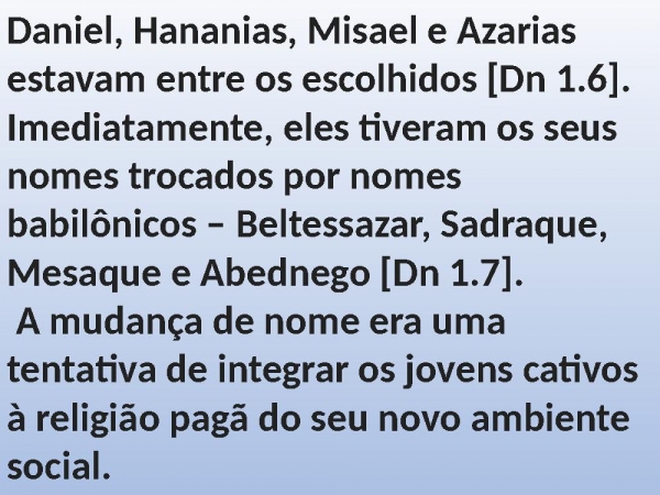 - Daniel, Hananias, Misael e Azarias estavam entre os escolhidos [Dn 1.6]. Imediatamente, eles tiveram os seus nomes trocados por nomes babilônicos – Beltessazar, Sadraque, Mesaque e Abednego [Dn 1.7]. A mudança de nome era uma tentativa de integrar os jovens cativos à religião pagã do seu novo ambiente social.