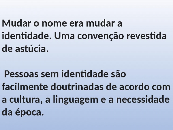 - Mudar o nome era mudar a identidade. Uma convenção revestida de astúcia. Pessoas sem identidade são facilmente doutrinadas de acordo com a cultura, a linguagem e a necessidade da época.
