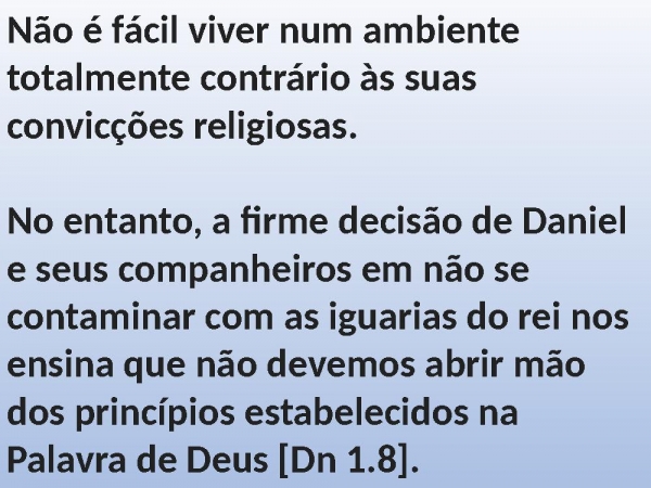 - Não é fácil viver num ambiente totalmente contrário às suas convicções religiosas. No entanto, a firme decisão de Daniel e seus companheiros em não se contaminar com as iguarias do rei nos ensina que não devemos abrir mão dos princípios estabelecidos na Palavra de Deus [Dn 1.8].