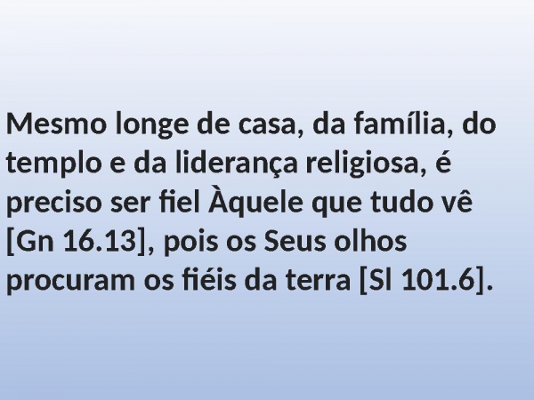 - Mesmo longe de casa, da família, do templo e da liderança religiosa, é preciso ser fiel Àquele que tudo vê [Gn 16.13], pois os Seus olhos procuram os fiéis da terra [Sl 101.6].