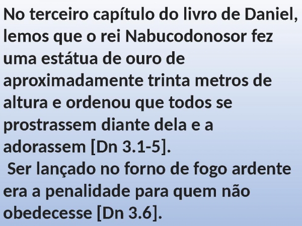 - No terceiro capítulo do livro de Daniel, lemos que o rei Nabucodonosor fez uma estátua de ouro de aproximadamente trinta metros de altura e ordenou que todos se prostrassem diante dela e a adorassem [Dn 3.1-5]. Ser lançado no forno de fogo ardente era a penalidade para quem não obedecesse [Dn 3.6].