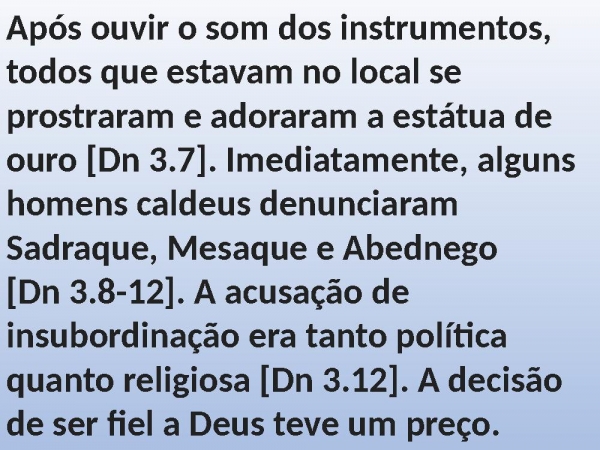 - Após ouvir o som dos instrumentos, todos que estavam no local se prostraram e adoraram a estátua de ouro [Dn 3.7]. Imediatamente, alguns homens caldeus denunciaram Sadraque, Mesaque e Abednego [Dn 3.8-12]. A acusação de insubordinação era tanto política quanto religiosa [Dn 3.12]. A decisão de ser fiel a Deus teve um preço.