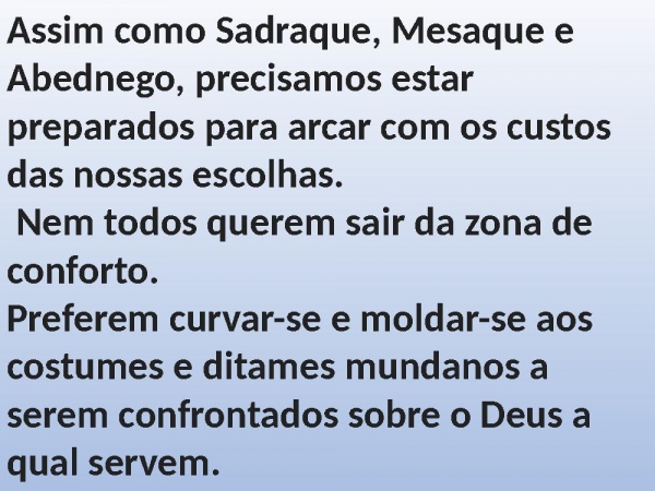 - Assim como Sadraque, Mesaque e Abednego, precisamos estar preparados para arcar com os custos das nossas escolhas. Nem todos querem sair da zona de conforto. Preferem curvar-se e moldar-se aos costumes e ditames mundanos a serem confrontados sobre o Deus a qual servem.