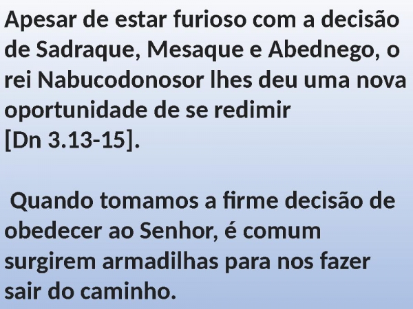 - Apesar de estar furioso com a decisão de Sadraque, Mesaque e Abednego, o rei Nabucodonosor lhes deu uma nova oportunidade de se redimir [Dn 3.13-15]. Quando tomamos a firme decisão de obedecer ao Senhor, é comum surgirem armadilhas para nos fazer sair do caminho.