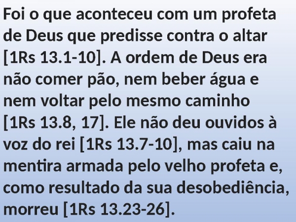 - Foi o que aconteceu com um profeta de Deus que predisse contra o altar [1Rs 13.1-10]. A ordem de Deus era não comer pão, nem beber água e nem voltar pelo mesmo caminho [1Rs 13.8, 17]. Ele não deu ouvidos à voz do rei [1Rs 13.7-10], mas caiu na mentira armada pelo velho profeta e, como resultado da sua desobediência, morreu [1Rs 13.23-26].