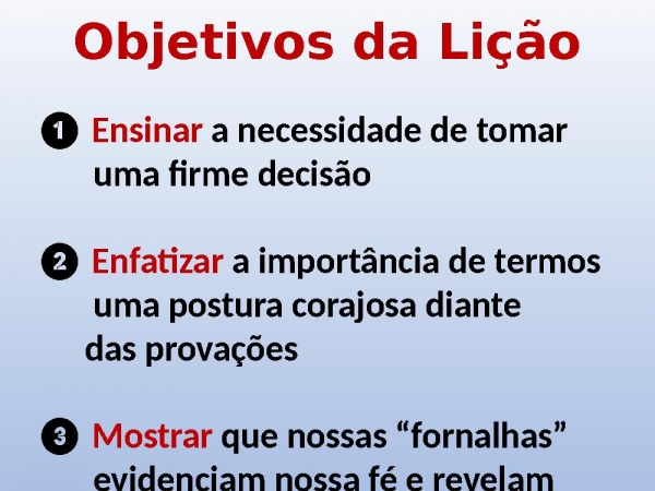 - Objetivos da Lição❶ Ensinar a necessidade de tomar uma firme decisão❷ Enfatizar a importância de termos uma postura corajosa diante das provações❸ Mostrar que nossas “fornalhas” evidenciam nossa fé e revelam o poder de Deus