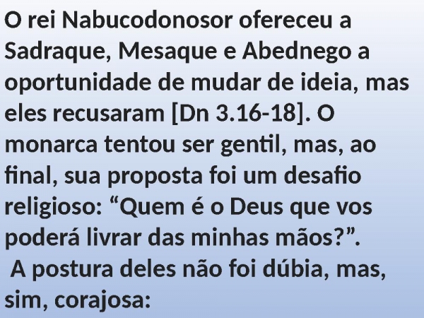 - O rei Nabucodonosor ofereceu a Sadraque, Mesaque e Abednego a oportunidade de mudar de ideia, mas eles recusaram [Dn 3.16-18]. O monarca tentou ser gentil, mas, ao final, sua proposta foi um desafio religioso: “Quem é o Deus que vos poderá livrar das minhas mãos?”. A postura deles não foi dúbia, mas, sim, corajosa: