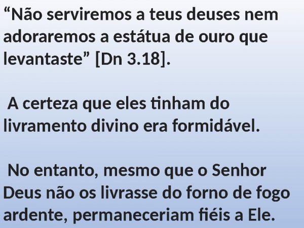 - “Não serviremos a teus deuses nem adoraremos a estátua de ouro que levantaste” [Dn 3.18]. A certeza que eles tinham do livramento divino era formidável. No entanto, mesmo que o Senhor Deus não os livrasse do forno de fogo ardente, permaneceriam fiéis a Ele.