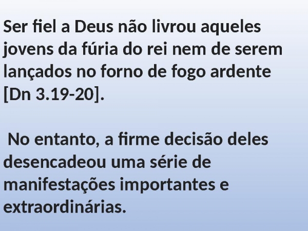 - Ser fiel a Deus não livrou aqueles jovens da fúria do rei nem de serem lançados no forno de fogo ardente [Dn 3.19-20]. No entanto, a firme decisão deles desencadeou uma série de manifestações importantes e extraordinárias.