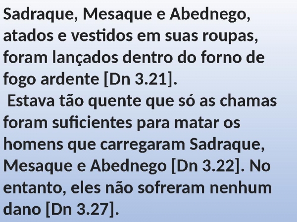 - Sadraque, Mesaque e Abednego, atados e vestidos em suas roupas, foram lançados dentro do forno de fogo ardente [Dn 3.21]. Estava tão quente que só as chamas foram suficientes para matar os homens que carregaram Sadraque, Mesaque e Abednego [Dn 3.22]. No entanto, eles não sofreram nenhum dano [Dn 3.27].