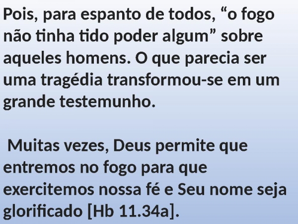 - Pois, para espanto de todos, “o fogo não tinha tido poder algum” sobre aqueles homens. O que parecia ser uma tragédia transformou-se em um grande testemunho. Muitas vezes, Deus permite que entremos no fogo para que exercitemos nossa fé e Seu nome seja glorificado [Hb 11.34a].