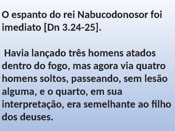 - O espanto do rei Nabucodonosor foi imediato [Dn 3.24-25]. Havia lançado três homens atados dentro do fogo, mas agora via quatro homens soltos, passeando, sem lesão alguma, e o quarto, em sua interpretação, era semelhante ao filho dos deuses.
