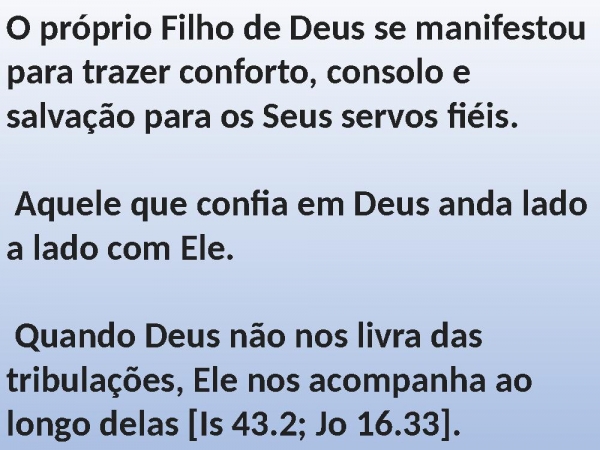 - O próprio Filho de Deus se manifestou para trazer conforto, consolo e salvação para os Seus servos fiéis. Aquele que confia em Deus anda lado a lado com Ele. Quando Deus não nos livra das tribulações, Ele nos acompanha ao longo delas [Is 43.2; Jo 16.33].