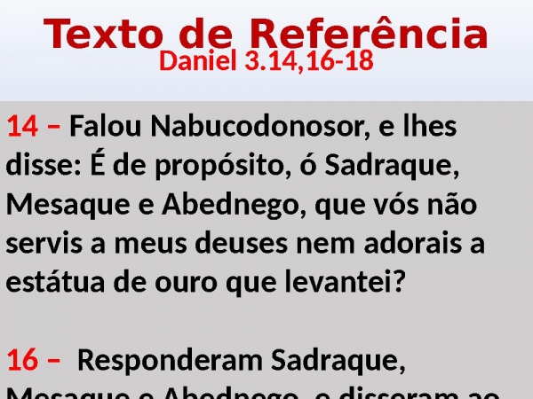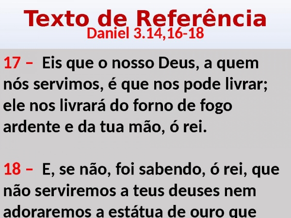 - Texto de ReferênciaDaniel 3.14,16-1817 – Eis que o nosso Deus, a quem nós servimos, é que nos pode livrar; ele nos livrará do forno de fogo ardente e da tua mão, ó rei.18 – E, se não, foi sabendo, ó rei, que não serviremos a teus deuses nem adoraremos a estátua de ouro que levantaste.