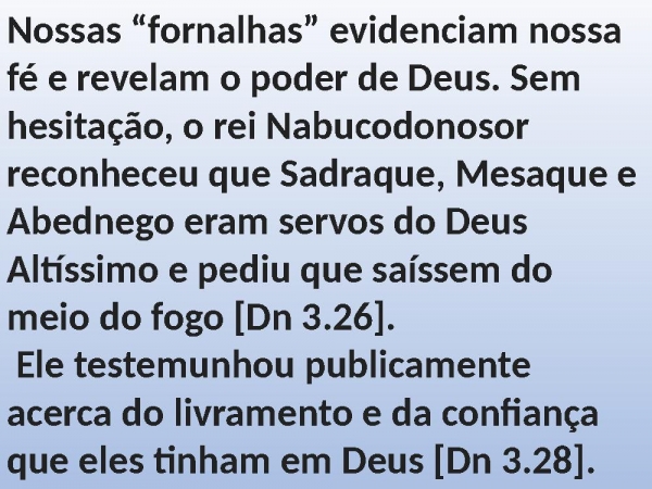 - Nossas “fornalhas” evidenciam nossa fé e revelam o poder de Deus. Sem hesitação, o rei Nabucodonosor reconheceu que Sadraque, Mesaque e Abednego eram servos do Deus Altíssimo e pediu que saíssem do meio do fogo [Dn 3.26]. Ele testemunhou publicamente acerca do livramento e da confiança que eles tinham em Deus [Dn 3.28].