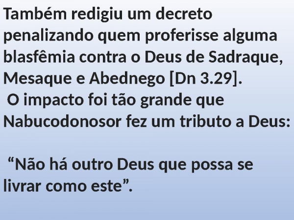 - Também redigiu um decreto penalizando quem proferisse alguma blasfêmia contra o Deus de Sadraque, Mesaque e Abednego [Dn 3.29]. O impacto foi tão grande que Nabucodonosor fez um tributo a Deus: “Não há outro Deus que possa se livrar como este”.