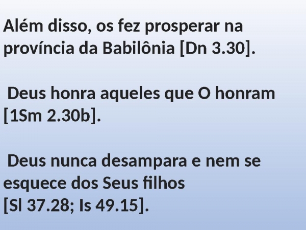 - Além disso, os fez prosperar na província da Babilônia [Dn 3.30]. Deus honra aqueles que O honram [1Sm 2.30b]. Deus nunca desampara e nem se esquece dos Seus filhos [Sl 37.28; Is 49.15].