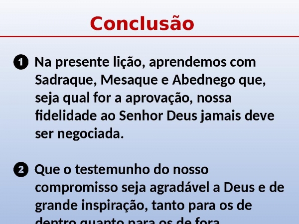 - Conclusão ❶ Na presente lição, aprendemos com Sadraque, Mesaque e Abednego que, seja qual for a aprovação, nossa fidelidade ao Senhor Deus jamais deve ser negociada.❷ Que o testemunho do nosso compromisso seja agradável a Deus e de grande inspiração, tanto para os de dentro quanto para os de fora.