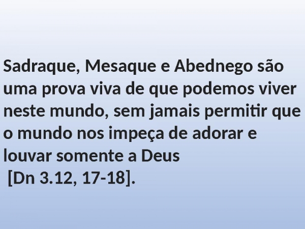 - Sadraque, Mesaque e Abednego são uma prova viva de que podemos viver neste mundo, sem jamais permitir que o mundo nos impeça de adorar e louvar somente a Deus [Dn 3.12, 17-18].