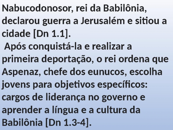 - Nabucodonosor, rei da Babilônia, declarou guerra a Jerusalém e sitiou a cidade [Dn 1.1]. Após conquistá-la e realizar a primeira deportação, o rei ordena que Aspenaz, chefe dos eunucos, escolha jovens para objetivos específicos: cargos de liderança no governo e aprender a língua e a cultura da Babilônia [Dn 1.3-4].