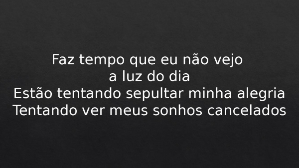 - Faz tempo que eu não vejo a luz do diaEstão tentando sepultar minha alegriaTentando ver meus sonhos cancelados