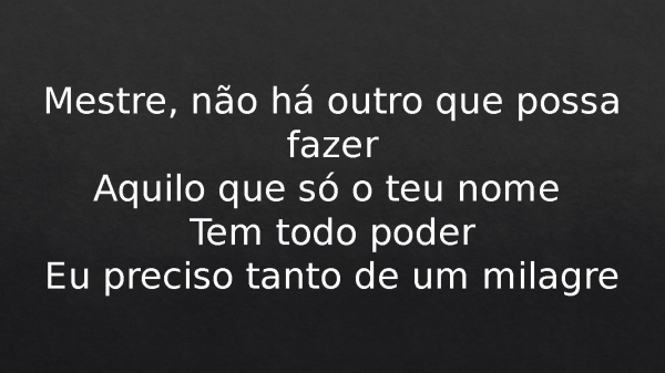 - Mestre, não há outro que possa fazerAquilo que só o teu nome Tem todo poderEu preciso tanto de um milagre