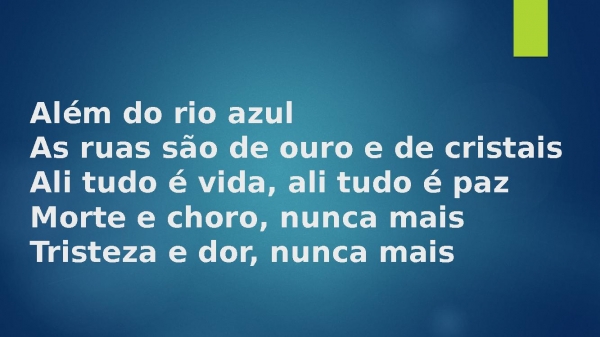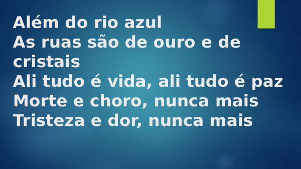 - Além do rio azulAs ruas são de ouro e de cristaisAli tudo é vida, ali tudo é pazMorte e choro, nunca maisTristeza e dor, nunca mais