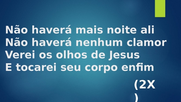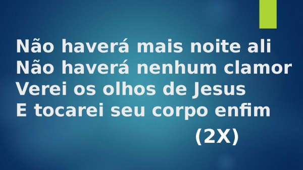 - Não haverá mais noite aliNão haverá nenhum clamorVerei os olhos de JesusE tocarei seu corpo enfim(2X)